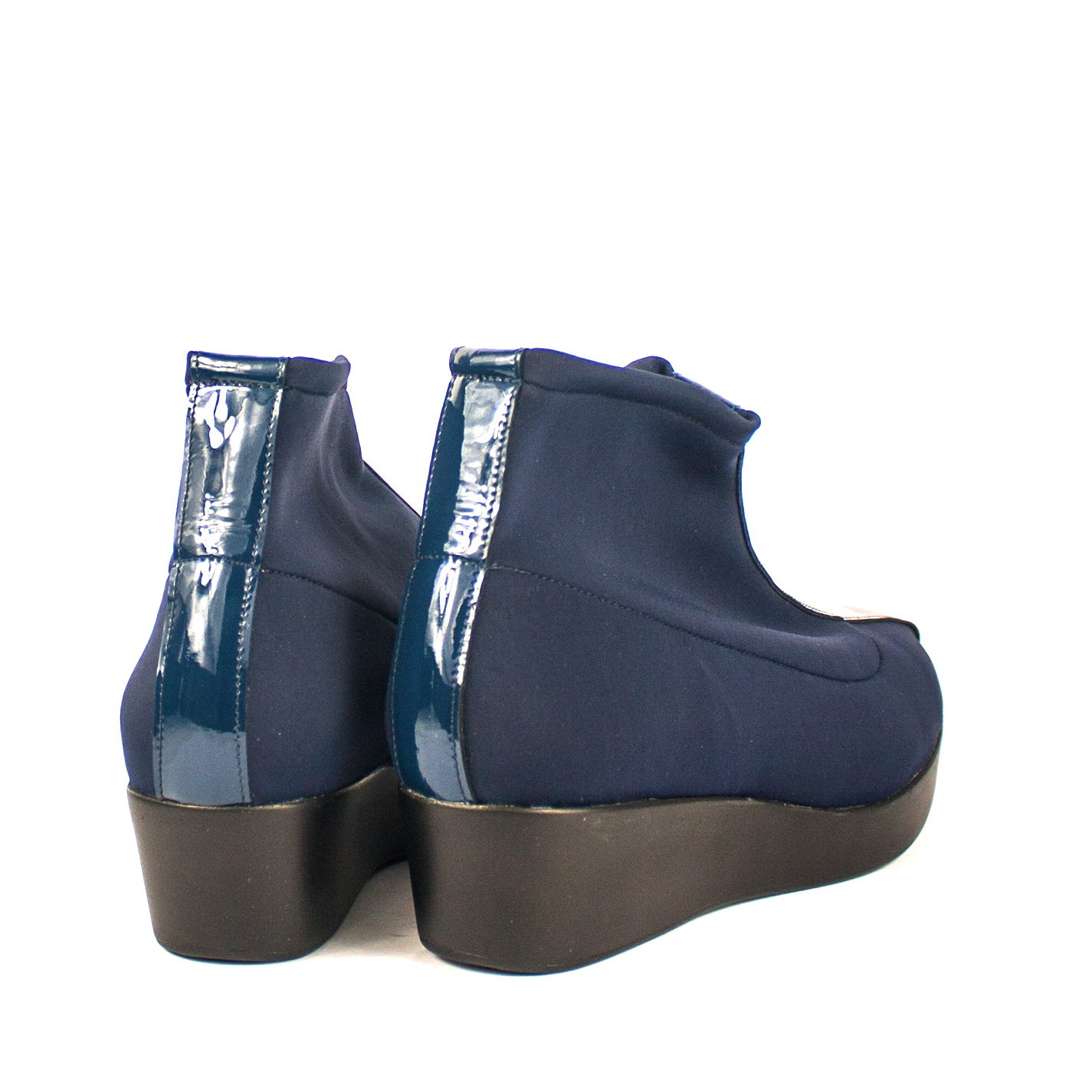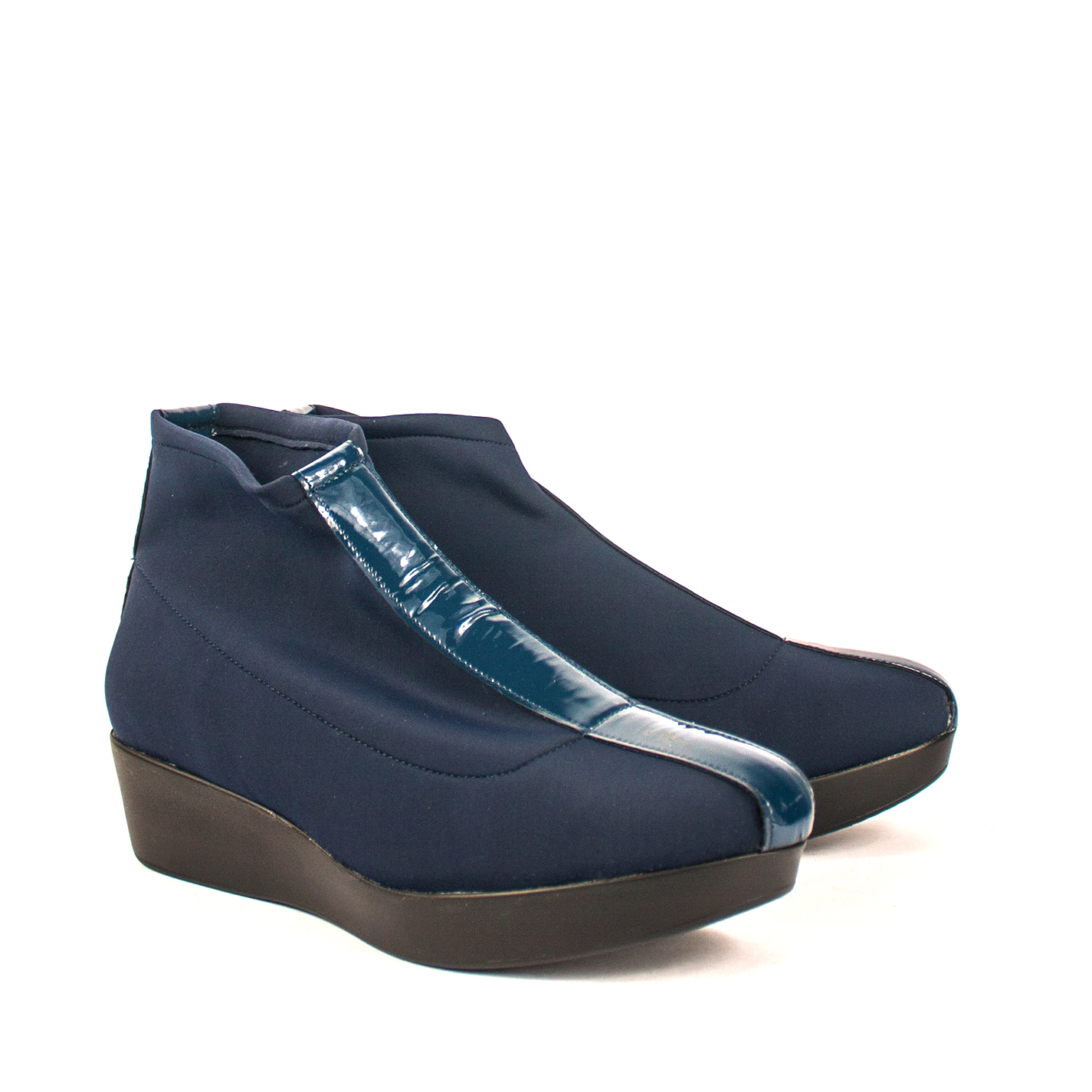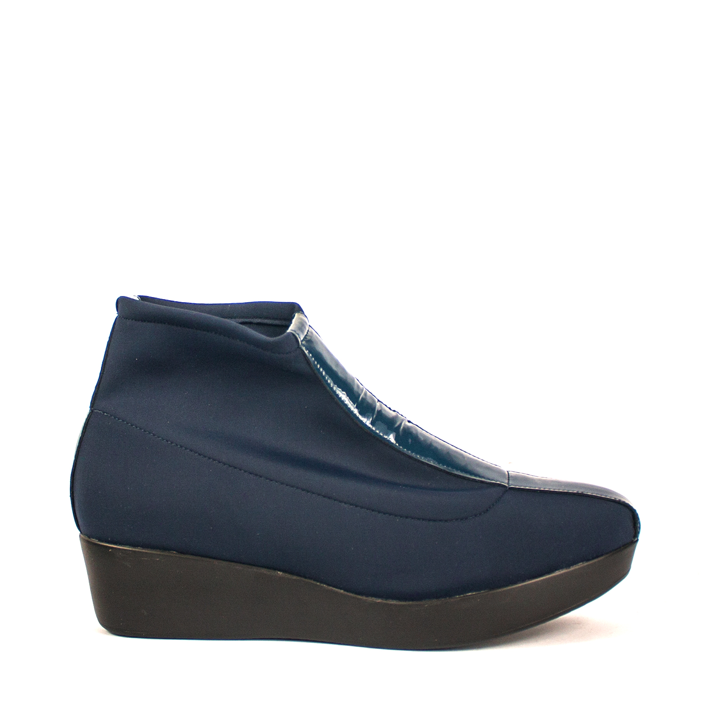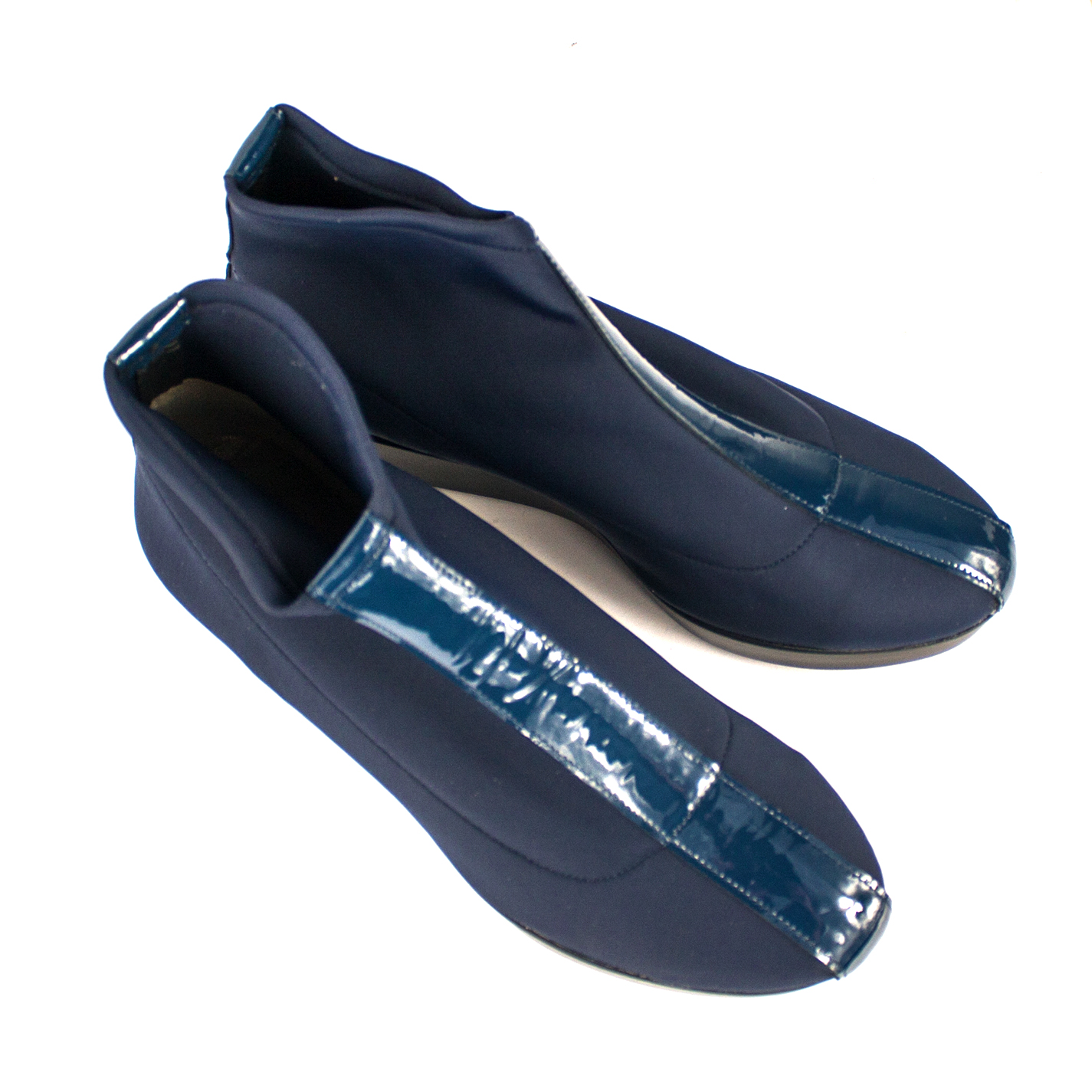 El modelo destaca por su tira central en charol brillante que recorre el empeine y el talón. Este detalle no es solo estético; crea una línea vertical que estiliza visualmente el pie y la pierna, aportando un toque de sofisticación al acabado mate del tejido elástico.