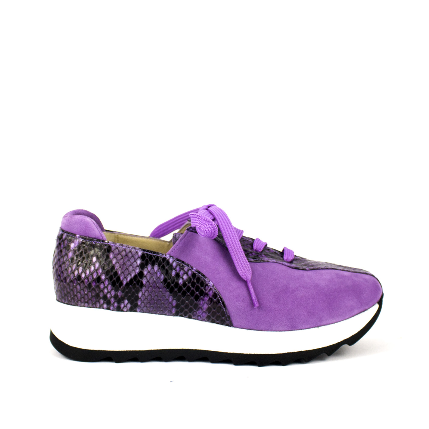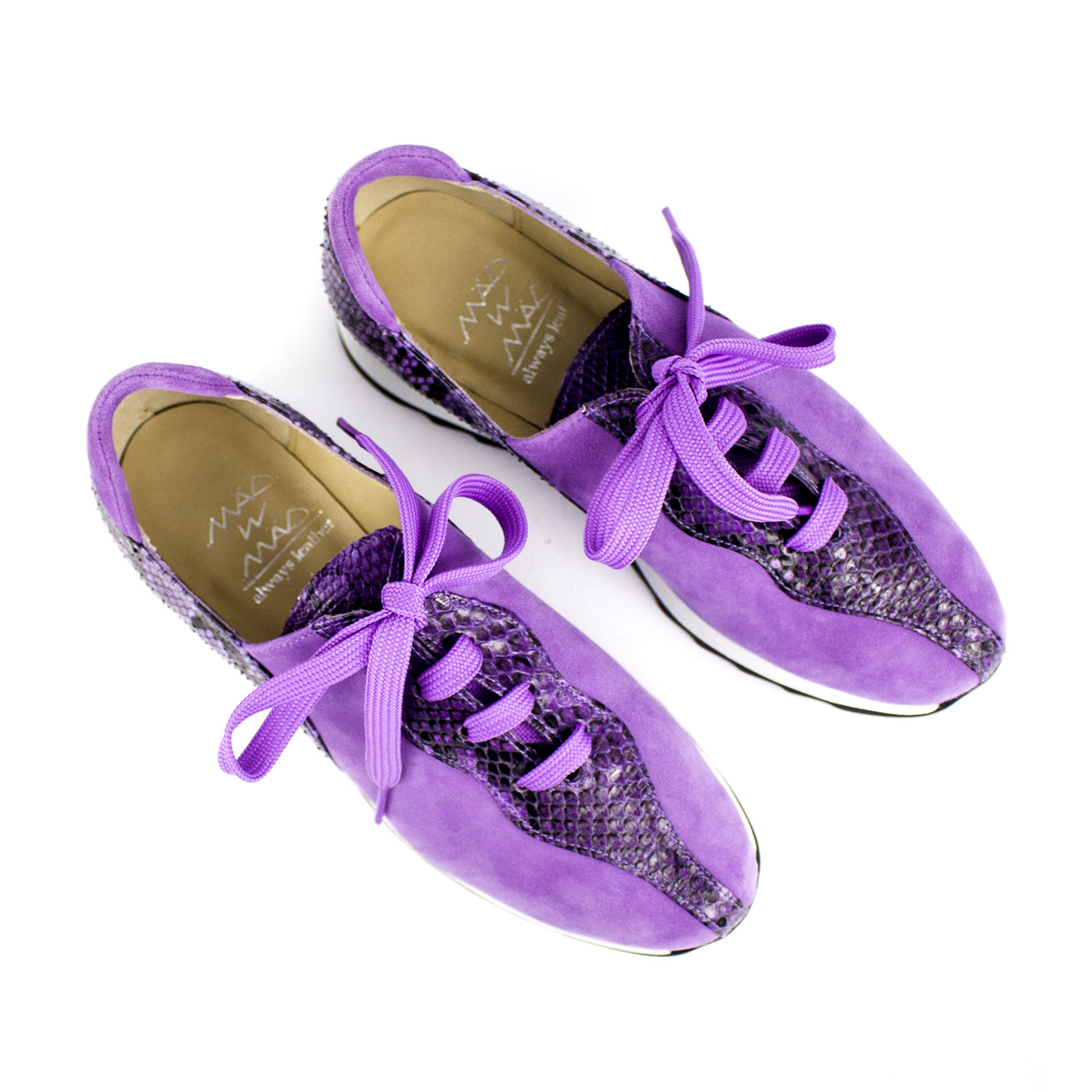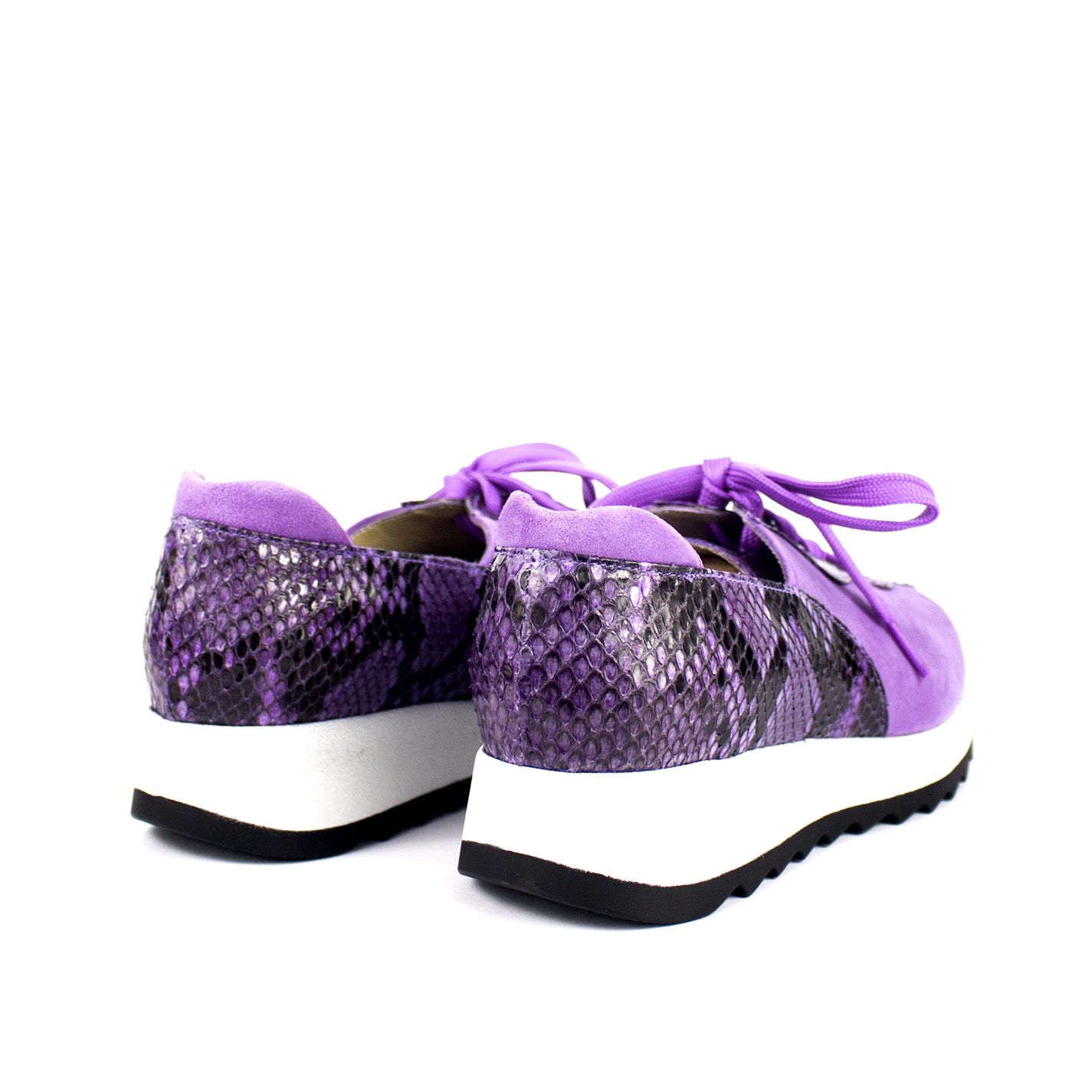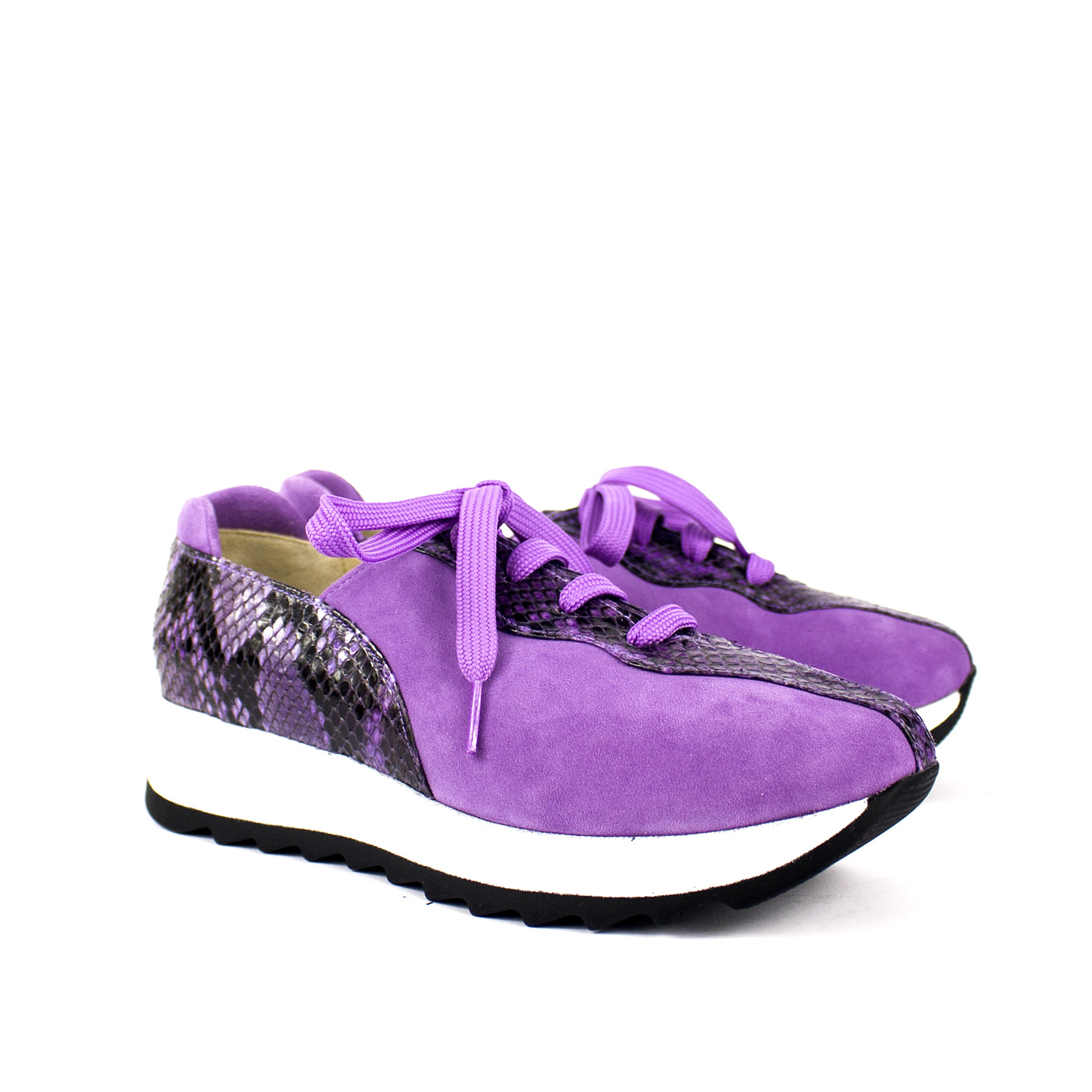 Cada par se fabrica de forma totalmente artesanal, cuidando cada costura para ofrecerte un producto único y duradero. El vibrante color morado del ante premium se fusiona con la textura exótica de la piel de pitón, creando un equilibrio perfecto entre lo deportivo y lo lujoso.