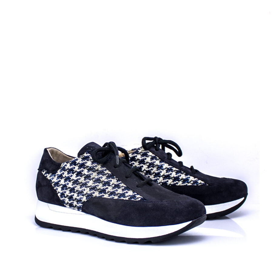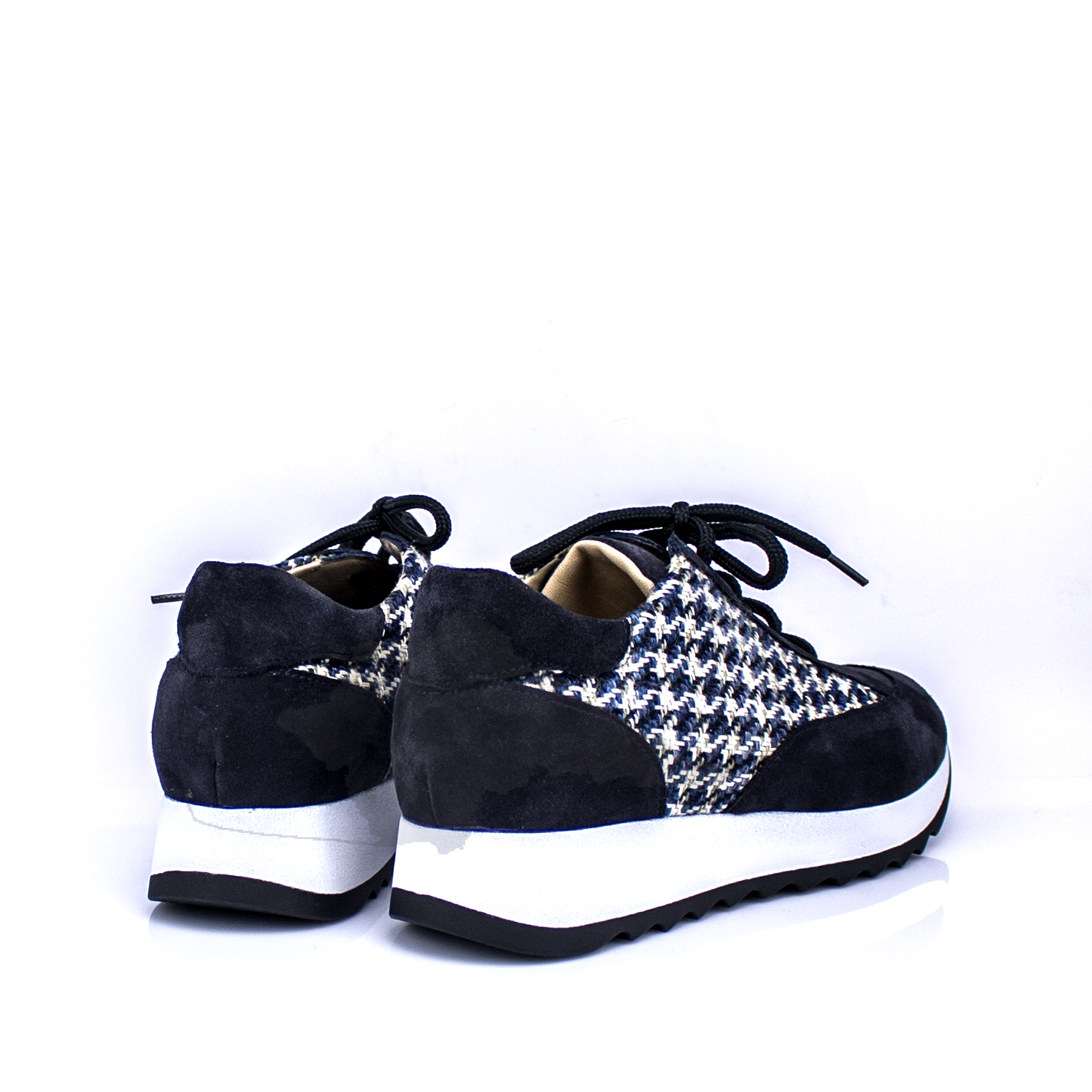 Sneakers azules de mujer hechas a mano en ante y lana pata de gallo, con cordones y plataforma.