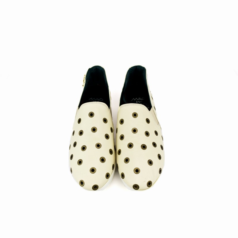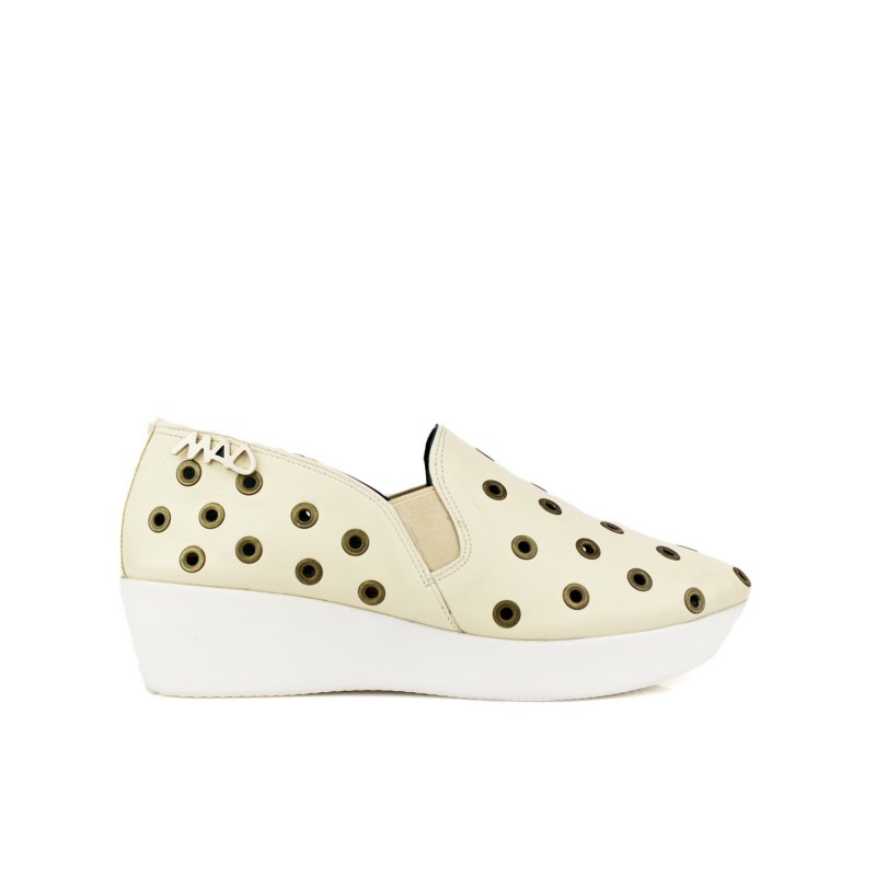 Sneakers deportivas revisitando un diseño tradicional de zueco moderno en piel para mujer, en color blanco crudo mariola con ojetes en oro viejo. Plataforma blanca de 2 cm y elástico a los lados para un mejor ajuste.