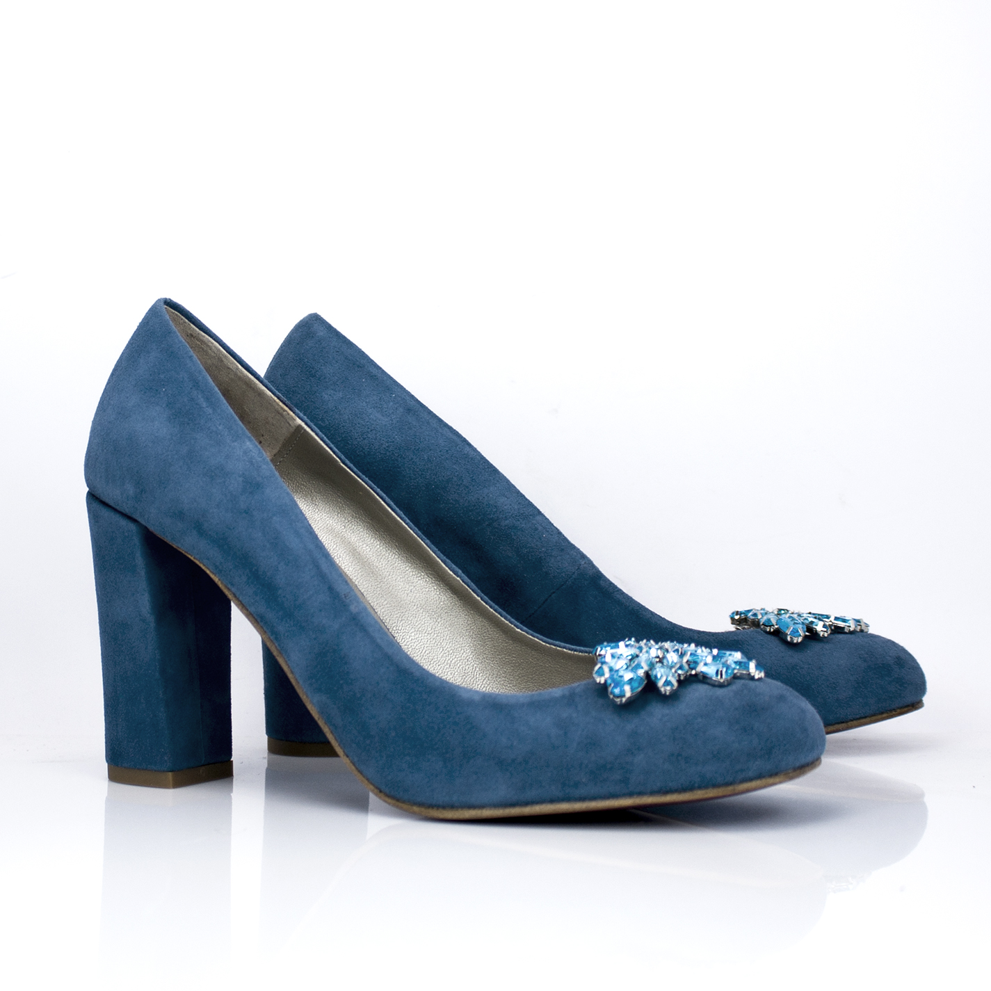 Zapatos con pedrería con un clip para quitar y poner. Realizado en ante con un tacón de 10 cm. Muestra en ante Prusia color azul. Personaliza el zapato a tu gusto en cualquier color o tipo de piel sin coste adicional, excepto pieles de pitón.