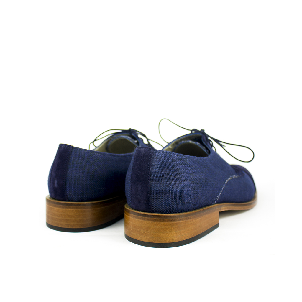 A primera vista, el Oxford Larranaga cautiva con su inteligente combinación de materiales de primera calidad. El cuerpo principal está confeccionado en un lino de alta resistencia en un vibrante azul cobalto, que aporta un toque de frescura y textura casual. Este material se complementa elegantemente con ante de tacto sedoso en azul marino oscuro, presente en la puntera, la zona de los cordones y el talón. Esta dualidad de texturas crea un contraste visualmente impactante que es a la vez relajado y sofisticado.