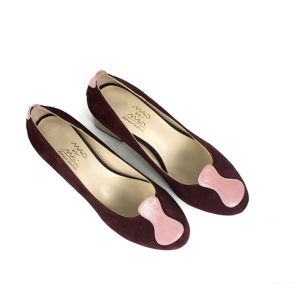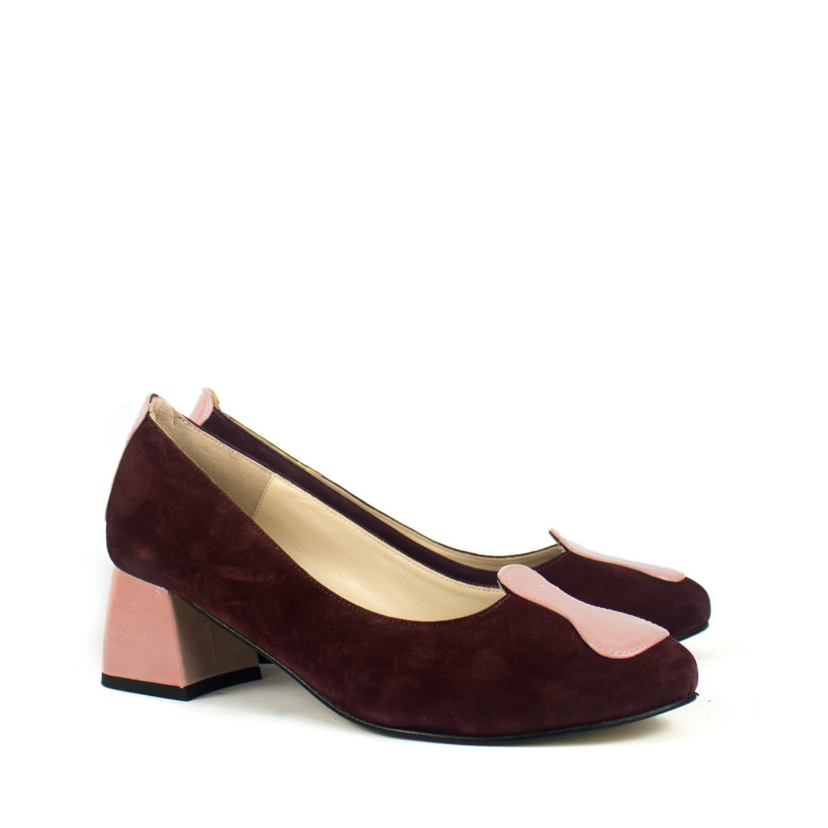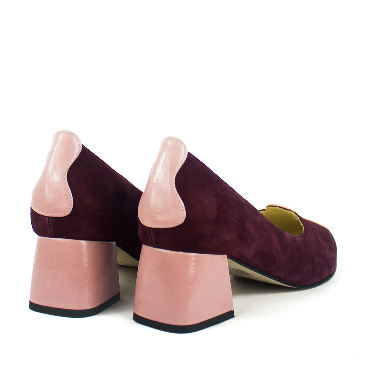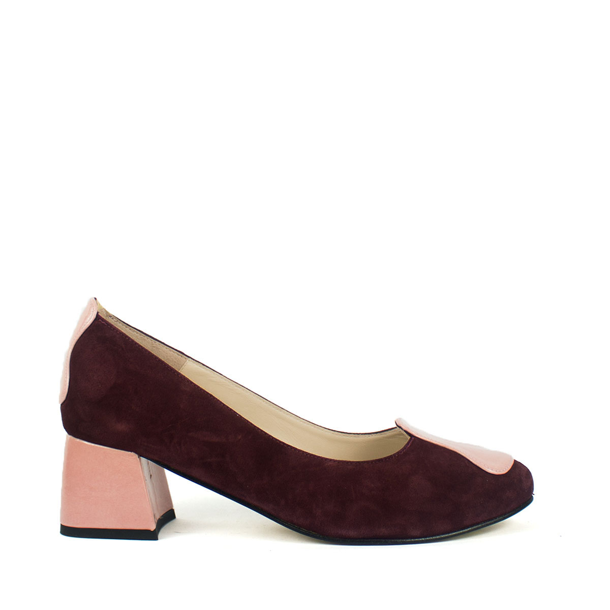 La calidez del ante color burdeos se encuentra con la dulzura del charol rosado en este diseño que es pura poesía visual. Creados para la mujer que aprecia el arte en cada detalle, estos zapatos de salón destacan por su adorno frontal, una pieza inspirada en los relojes líquidos de Salvador Dalí que parece fluir con gracia sobre la puntera.