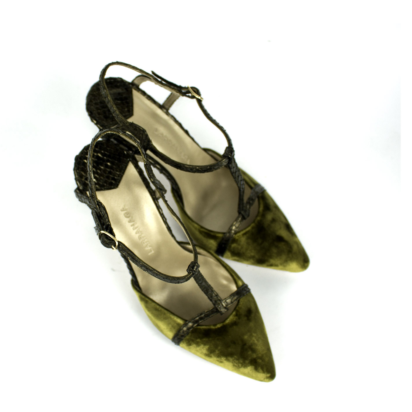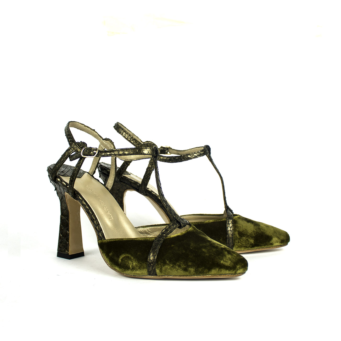 Redefine la elegancia con nuestros Zapatos de Tacón estilo T-Strap (Salomé). Este diseño, inspirado en la estética vintage más femenina, combina una silueta clásica con un toque moderno y atrevido. El modelo de la imagen destaca por su exquisita fusión de texturas: la suavidad del terciopelo verde musgo en la puntera y la fuerza visual de la piel de pitón en tono bronce en las correas y el tacón.